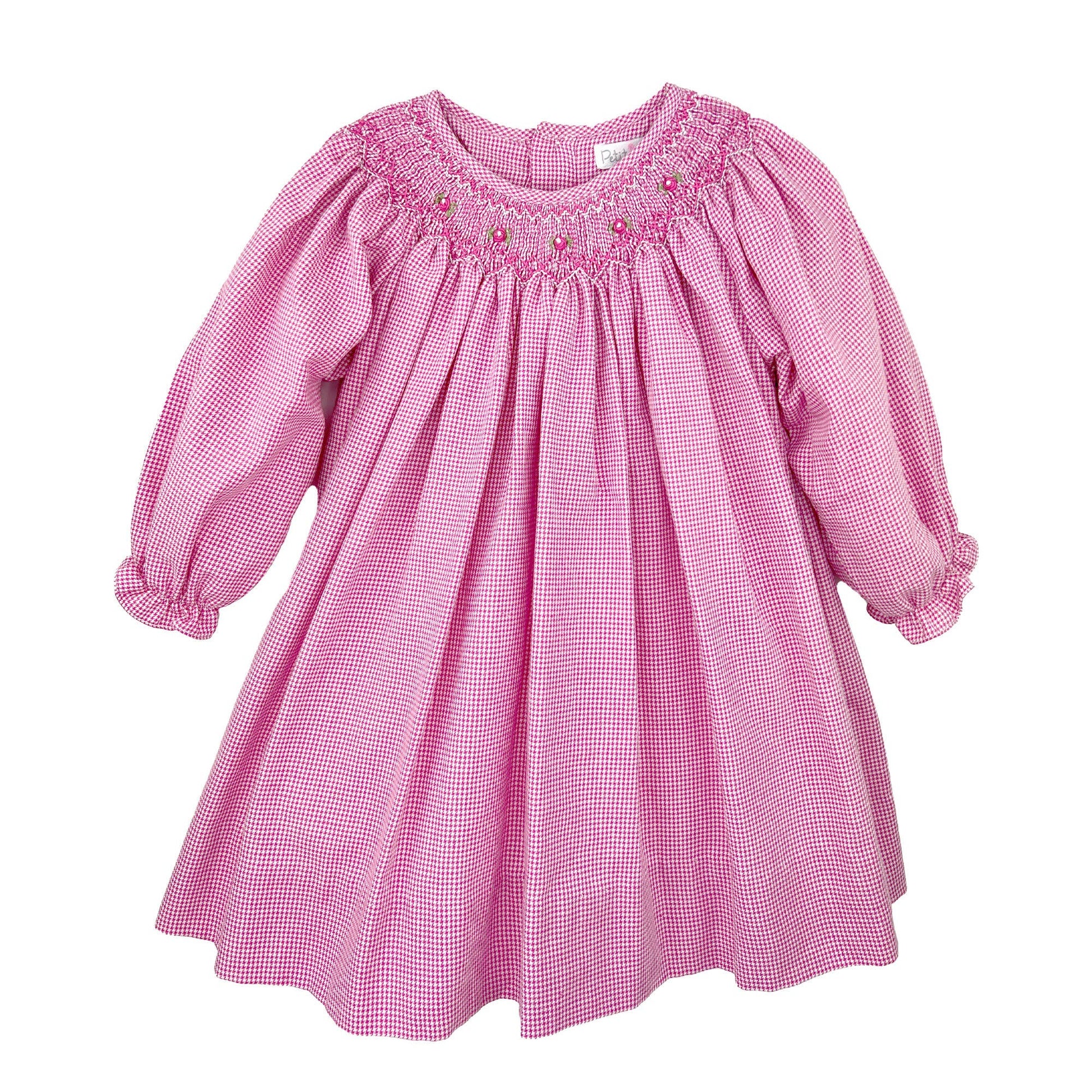 A soft and delicate long sleeve dress for baby girls makes a beautiful outfit for family photos and special occasions. This long sleeve dress comes in a pink houndstooth fabric that is perfect for fall and winter with bishop smocking with hand embroidered flowers and details. The lightweight cotton blend fabric keeps little ones cool and comfortable and is easy to care for - just machine wash and tumble dry.