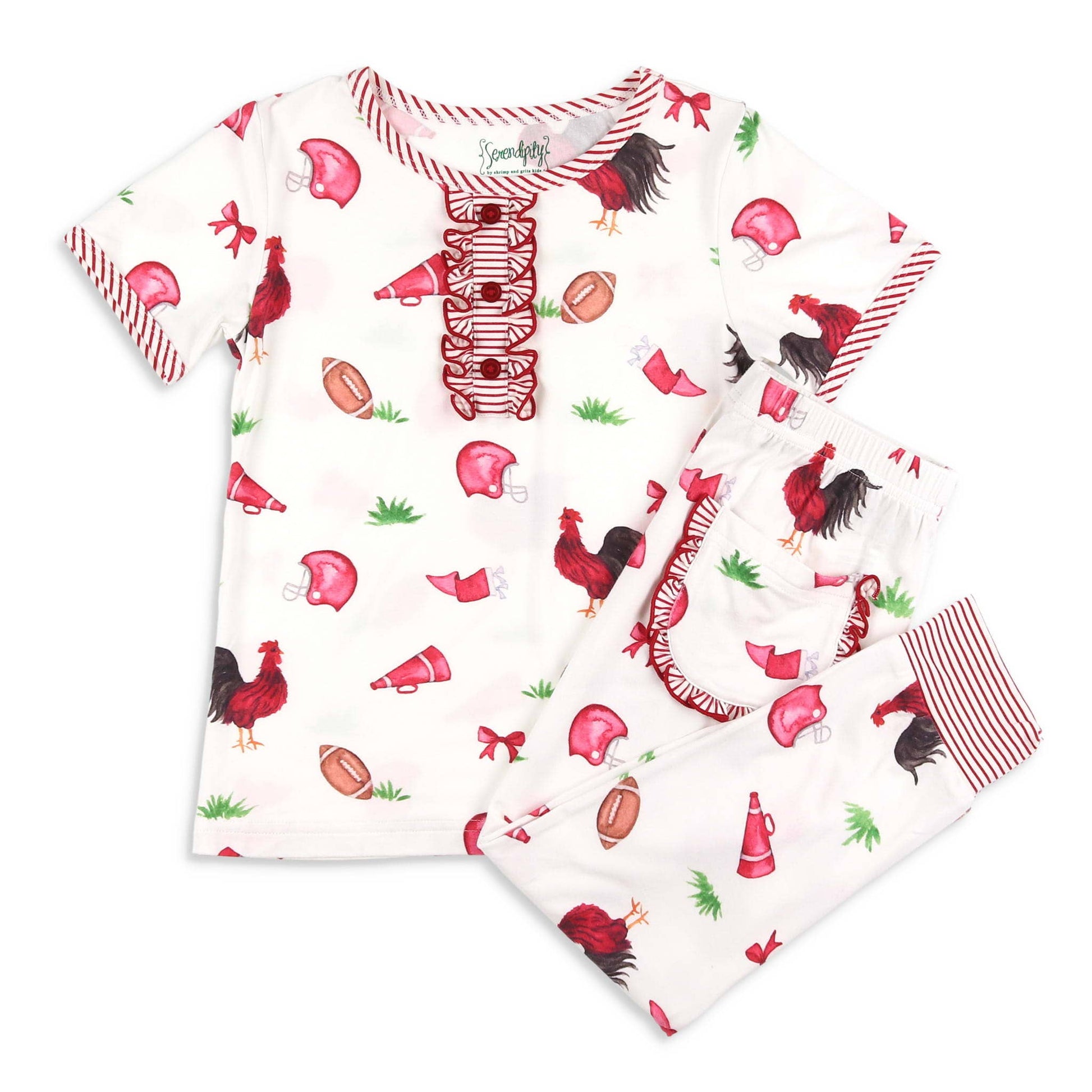 This enthusiastic Gameday Rooster Loungewear Set, features a watercolor print, hand painted by Megan Hewitt, owner and designer of SGK. These cute PJs will surely become a favorite staple during game season, especially if he is a budding football fan! Perfect for that special sleepover or just for staying home and taking in the big football game on TV with the family!