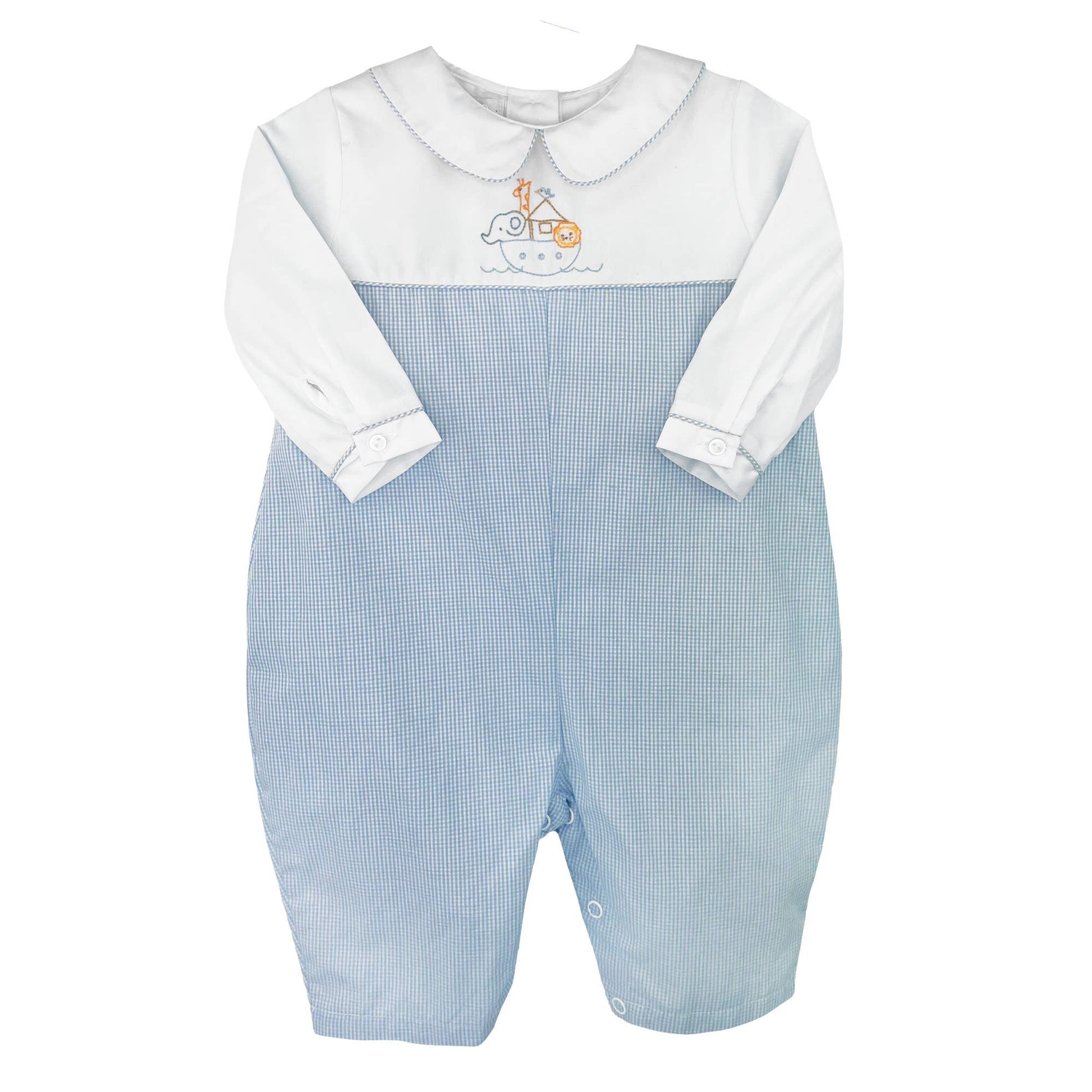 Our embroidered bubble comes in a soft pastel blue check fabric with Noah's Ark themed embroidery on the front. This peter pan collar long sleeve romper is made with a cotton-poly blend fabric that is lightweight, airy and machine washable for easy care!
