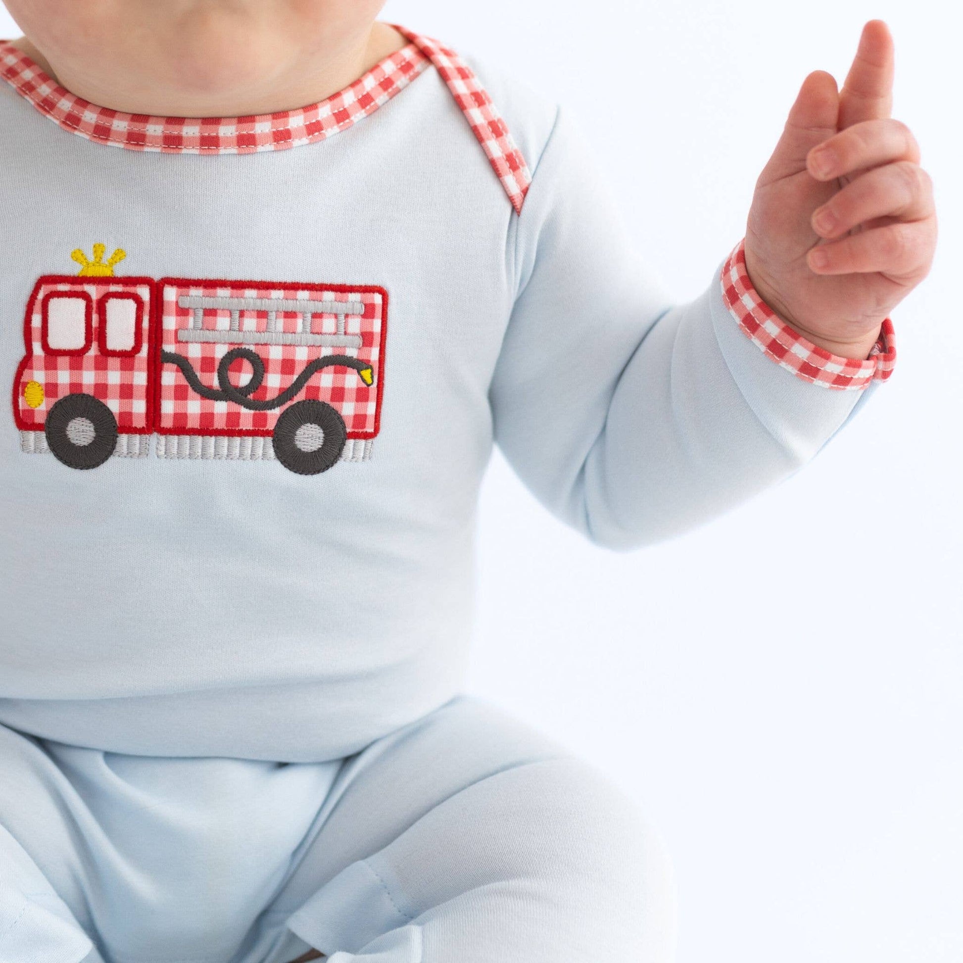 This charming Magnolia Baby lap footie is made from soft light blue Pima cotton and features a delightful firetruck applique in red gingham check. It's the perfect little footie for your little one.!